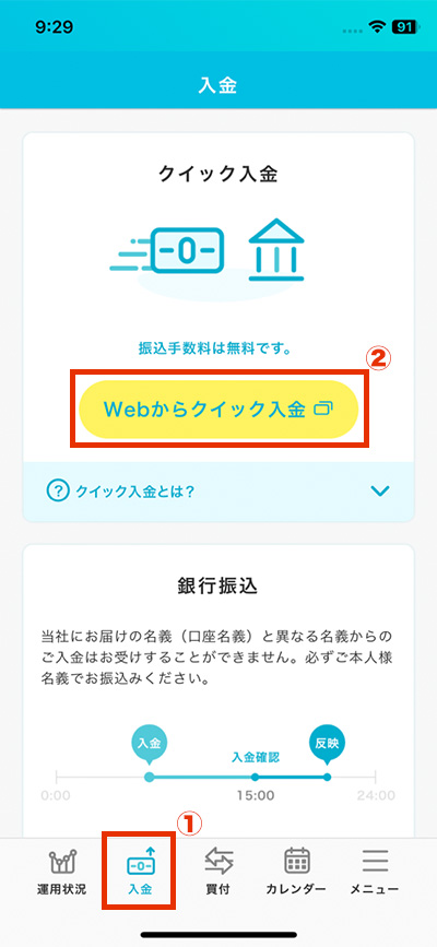 「Webからクイック入金」をタップして、マイページへ遷移します。