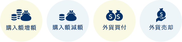 | 購入額 | 外貨:1通貨単位、円貨:100円以上1円単位(最低1通貨相当) |