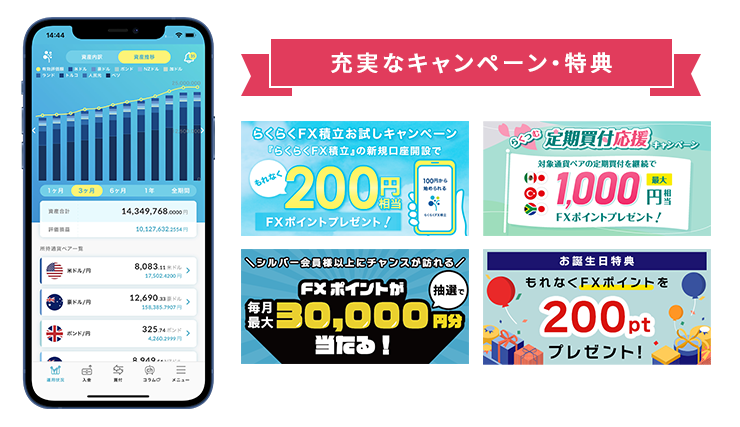 FXポイントとは、外為どっとコムのオリジナル・ポイントサービスで、各種サービスやキャンペーンによって獲得できるポイントです。FXポイントは、らくらくFX積立の買付注文に1ポイント1円として利用できます。FXポイントを利用することで、よりお得に『らくつむ』で買付をする際に、1ポイント1円として利用できます。